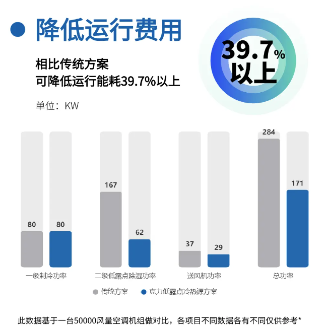 在惠州這一電子行業(yè)標桿項目中,克力低露點熱回收吊裝機組展現出卓越性能,相比傳統(tǒng)方案,克力冷凝熱無級回收系統(tǒng)節(jié)能比例達39.7%。